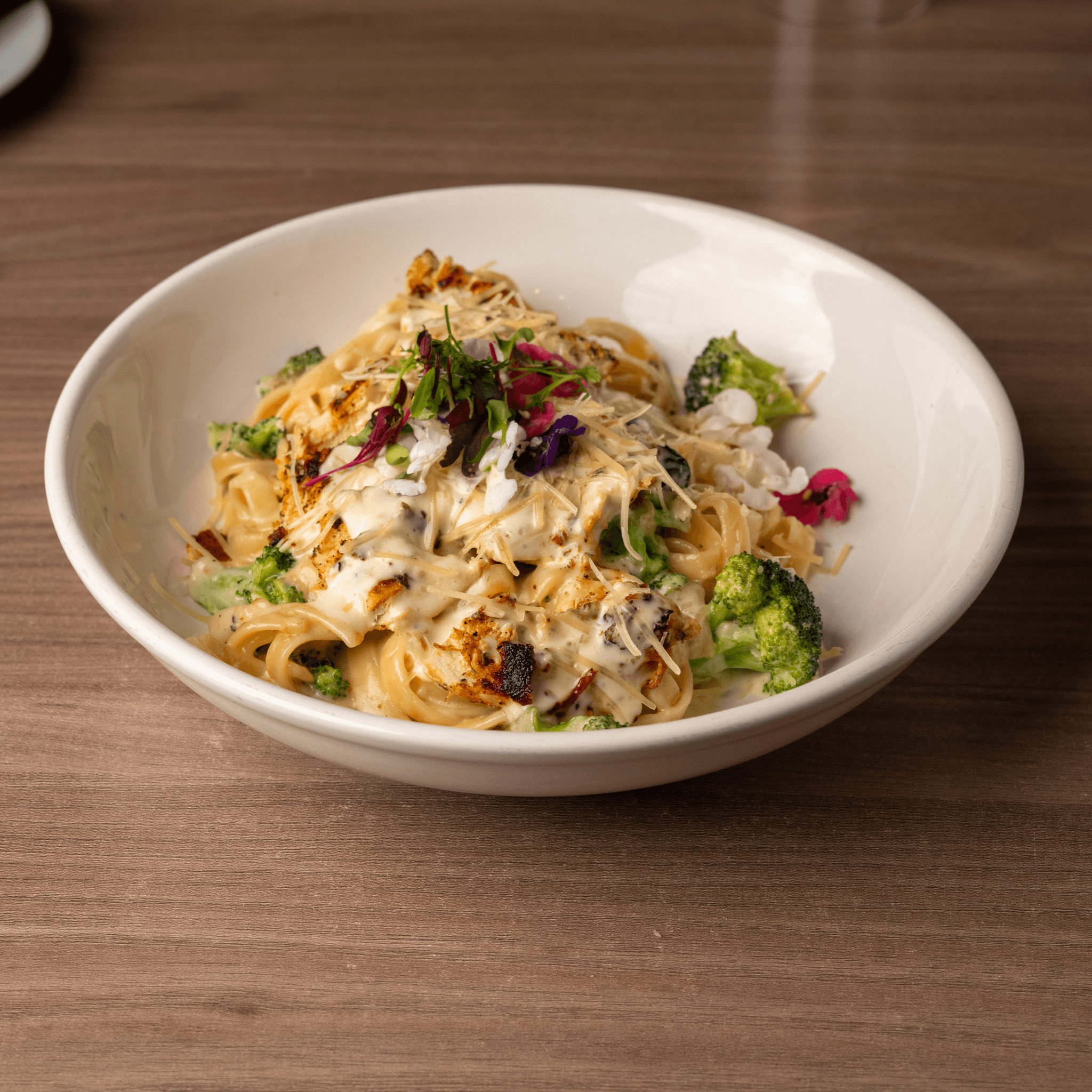 Chicken, tomato, mushroom, spinach, asiago cream sauce, linguine