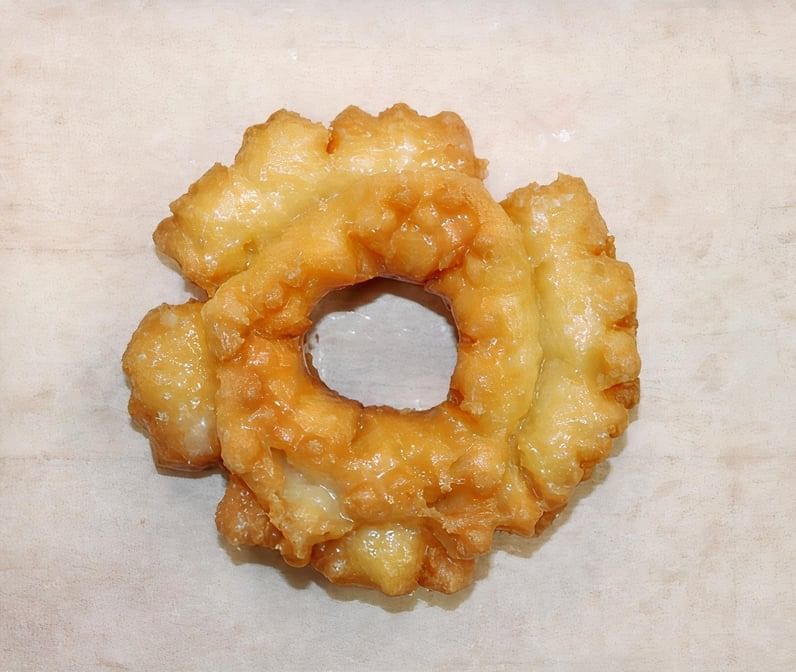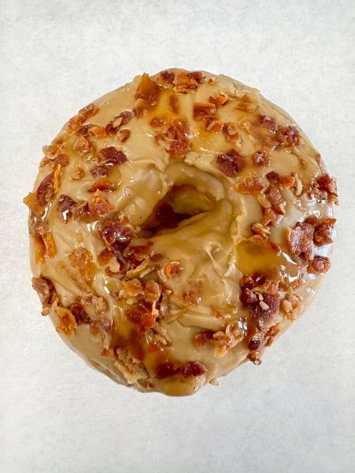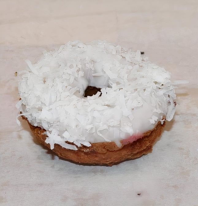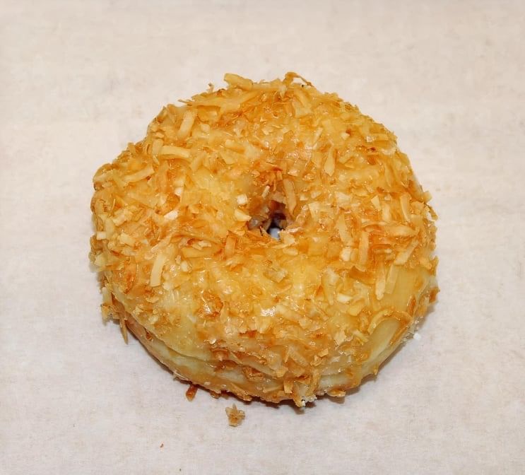 Covered in toasted coconut flakes, this raised donut offers a delightful contrast of textures with a soft, airy interior and a crunchy exterior