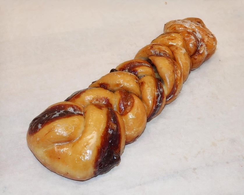 A twisted donut braid featuring a rich chocolate swirl and crunchy walnut pieces