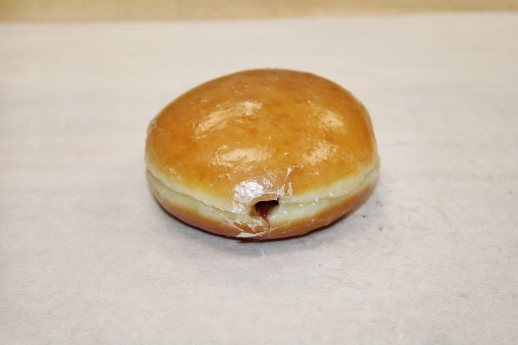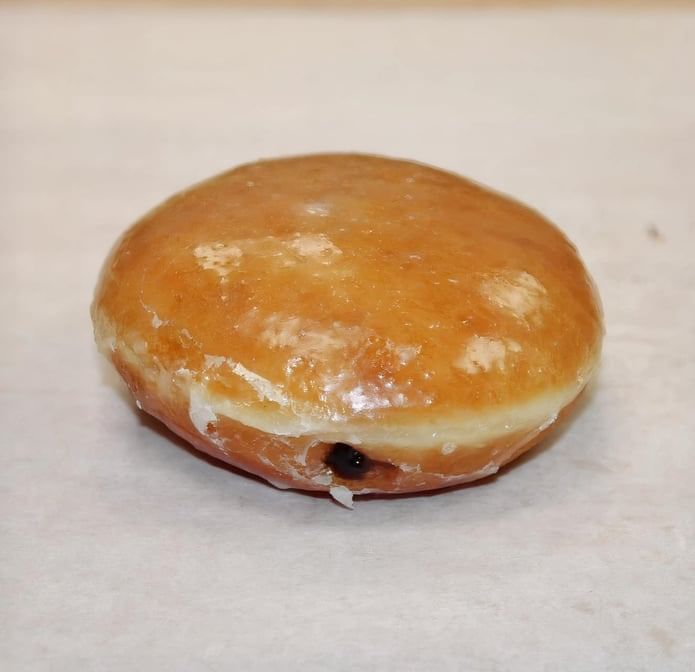 Soft donut filled with apple compote, topped with a generous layer of sweet, buttery crumb topping