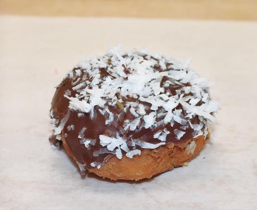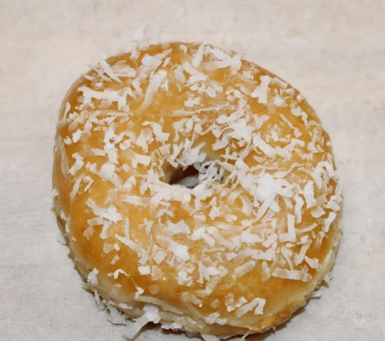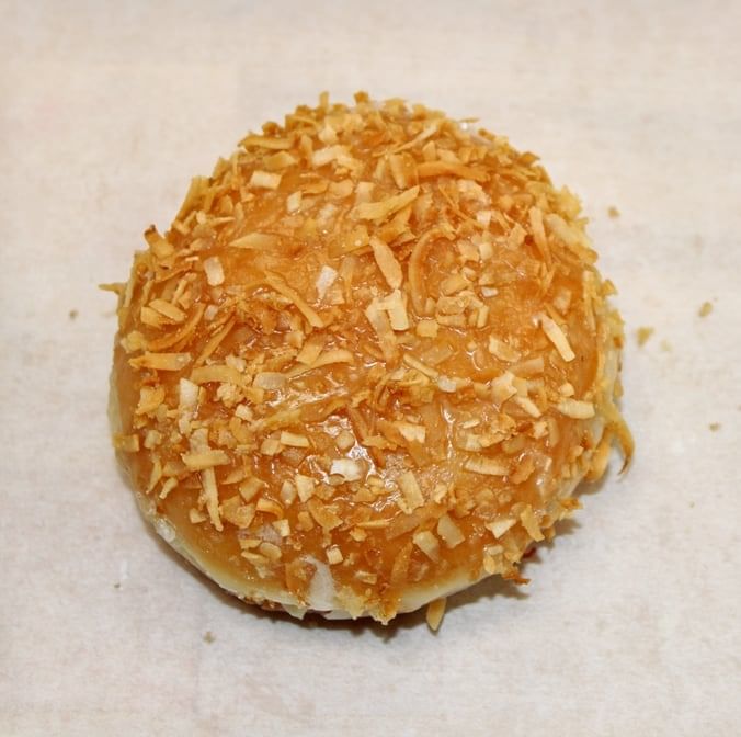 Soft donut filled with smooth coconut cream, topped with toasted coconut flakes