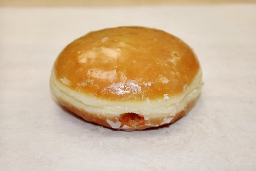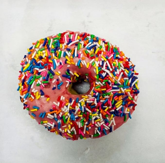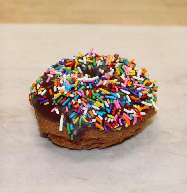 Covered in pink glaze and topped with colorful sprinkles, this raised donut offers a delightful combination of sweetness and crunch