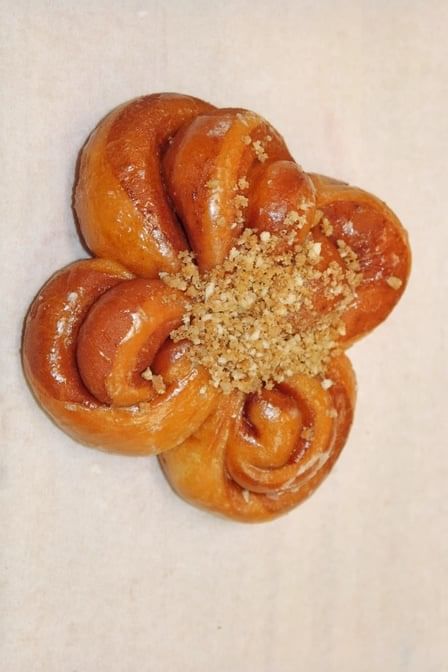 Delicate flower-shaped donut with a rich cinnamon swirl, topped with a sprinkle of crunchy streusel