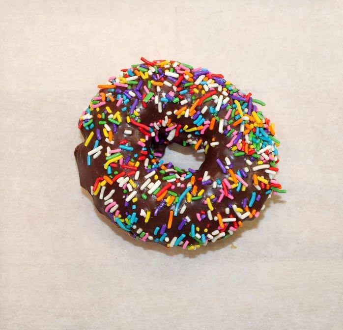 A raised donut topped with a chocolate glaze and colorful sprinkles