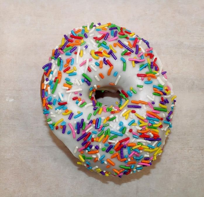 A fluffy donut topped with a smooth vanilla glaze and colorful sprinkles