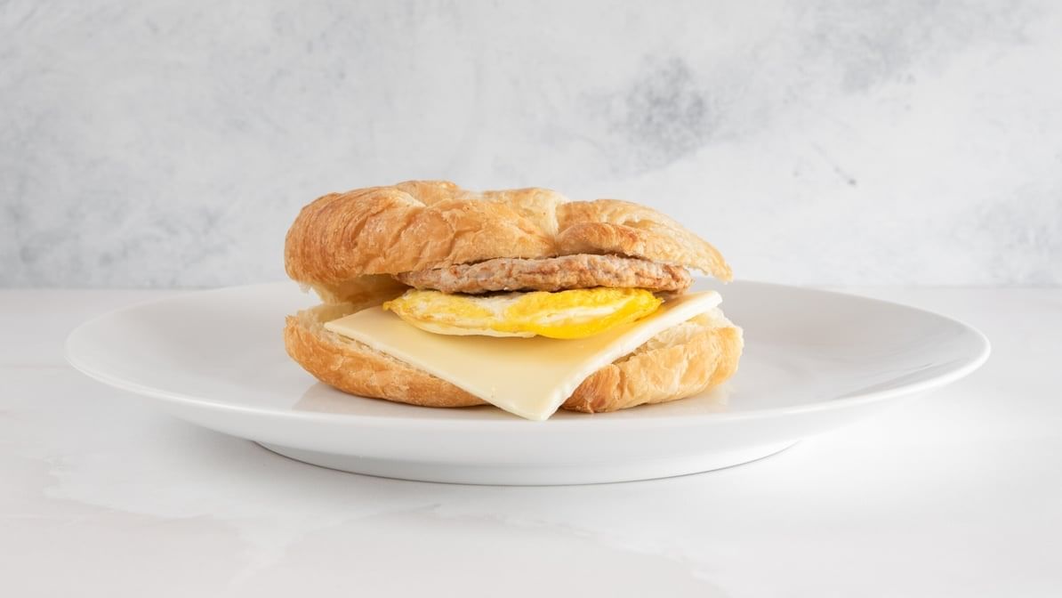 Croissant filled with choice of bacon, sausage, ham, or turkey, combined with egg and cheese. Options include single or mix of meats, or simply egg and cheese