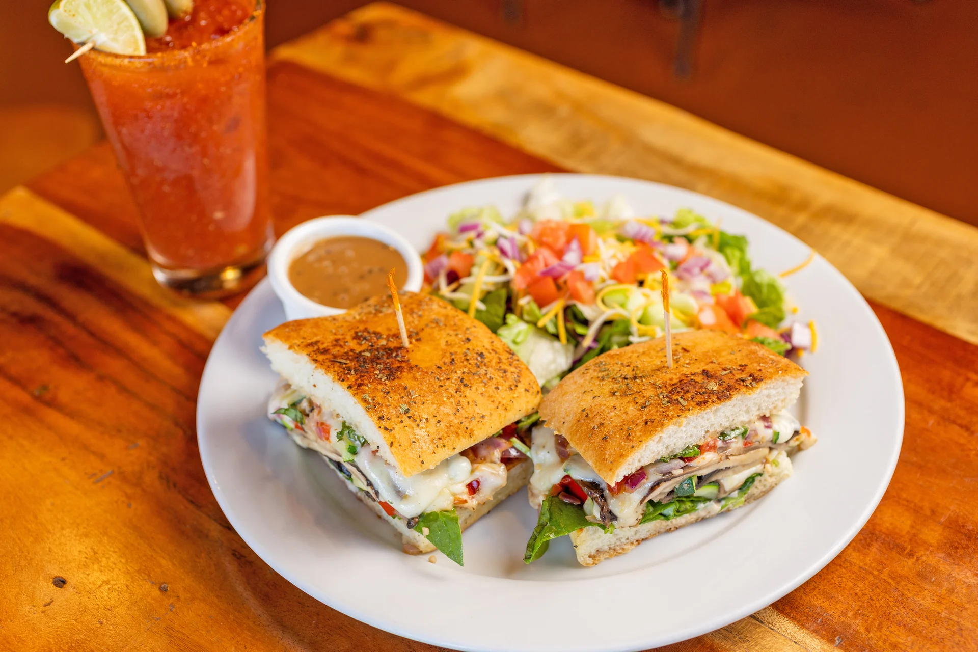 Sautéed Portobello, zucchini, red pepper, red onion, garlic, provolone cheese, balsamic mayonnaise, fresh basil, spinach, sun dried tomatoes on grilled focaccia.