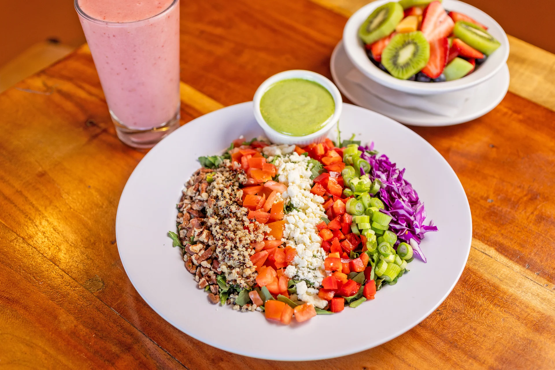 Arugula, diced pecans, tomatoes, red cabbage, dried cranberries, red pepper, green onions, feta cheese and quinoa. Add chicken. 3.99