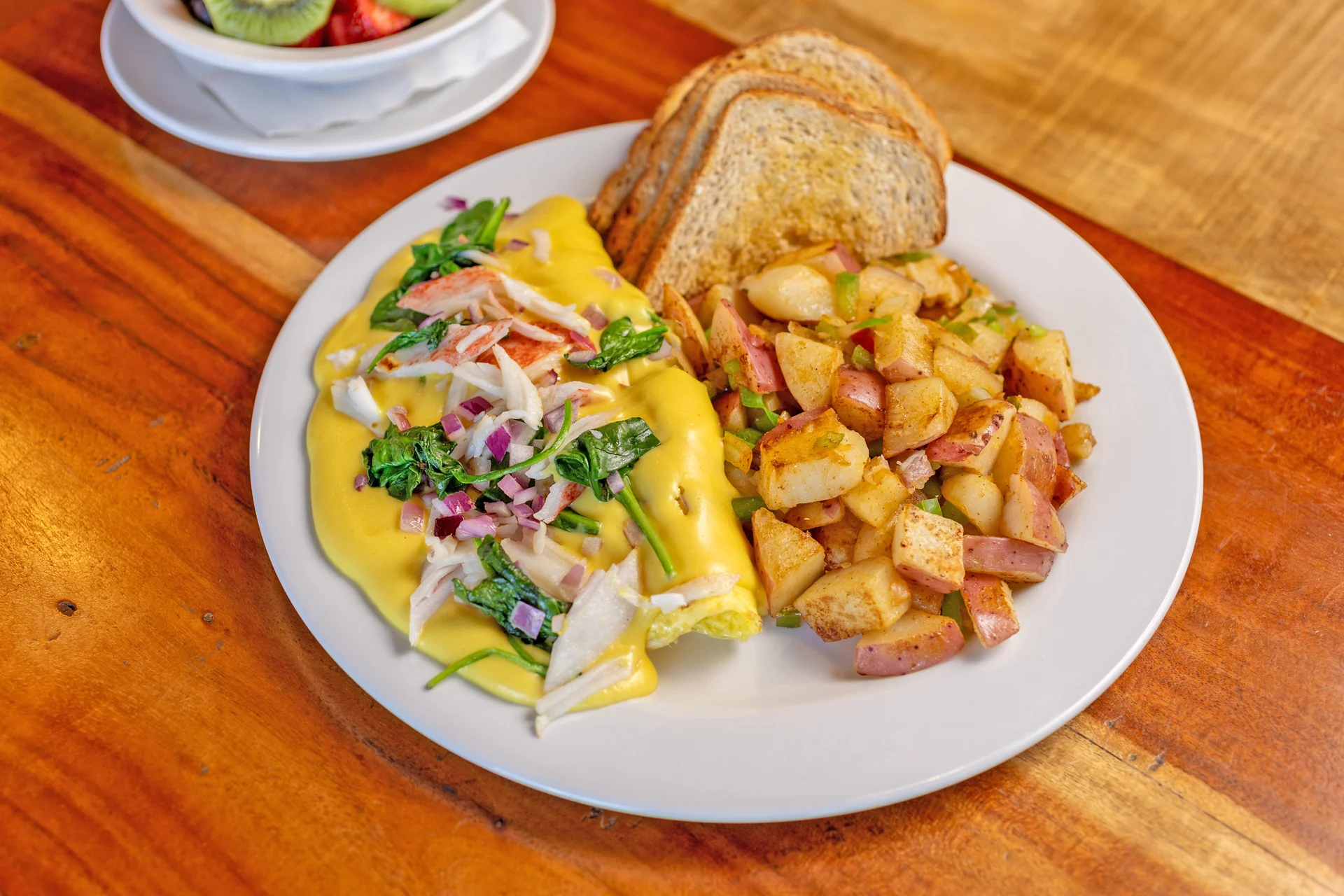 Sautéed spinach, red onions, crab meat, Hollandaise sauce and cream cheese.