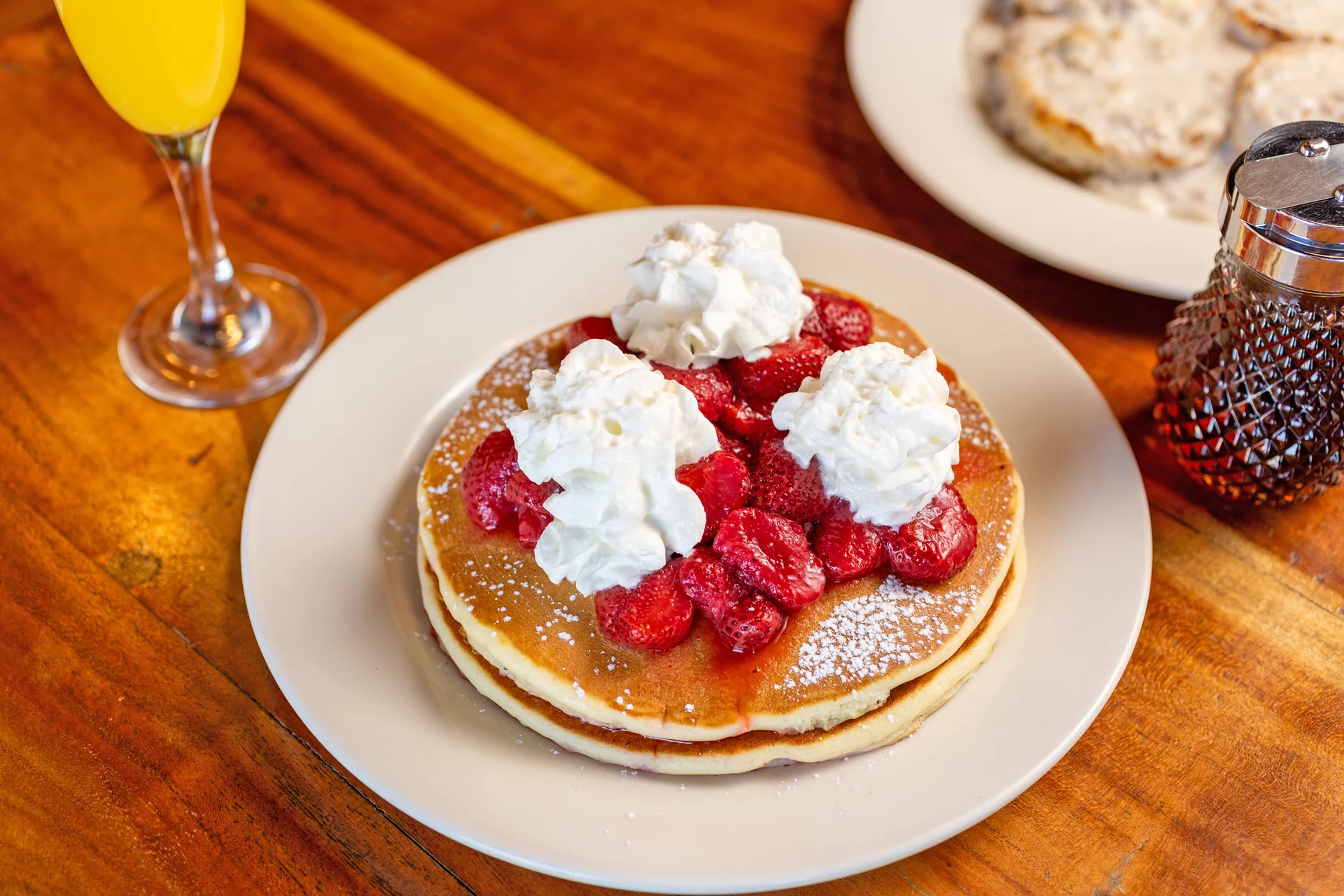 3 pancakes, bacon or sausage links, eggs and side of your choice.