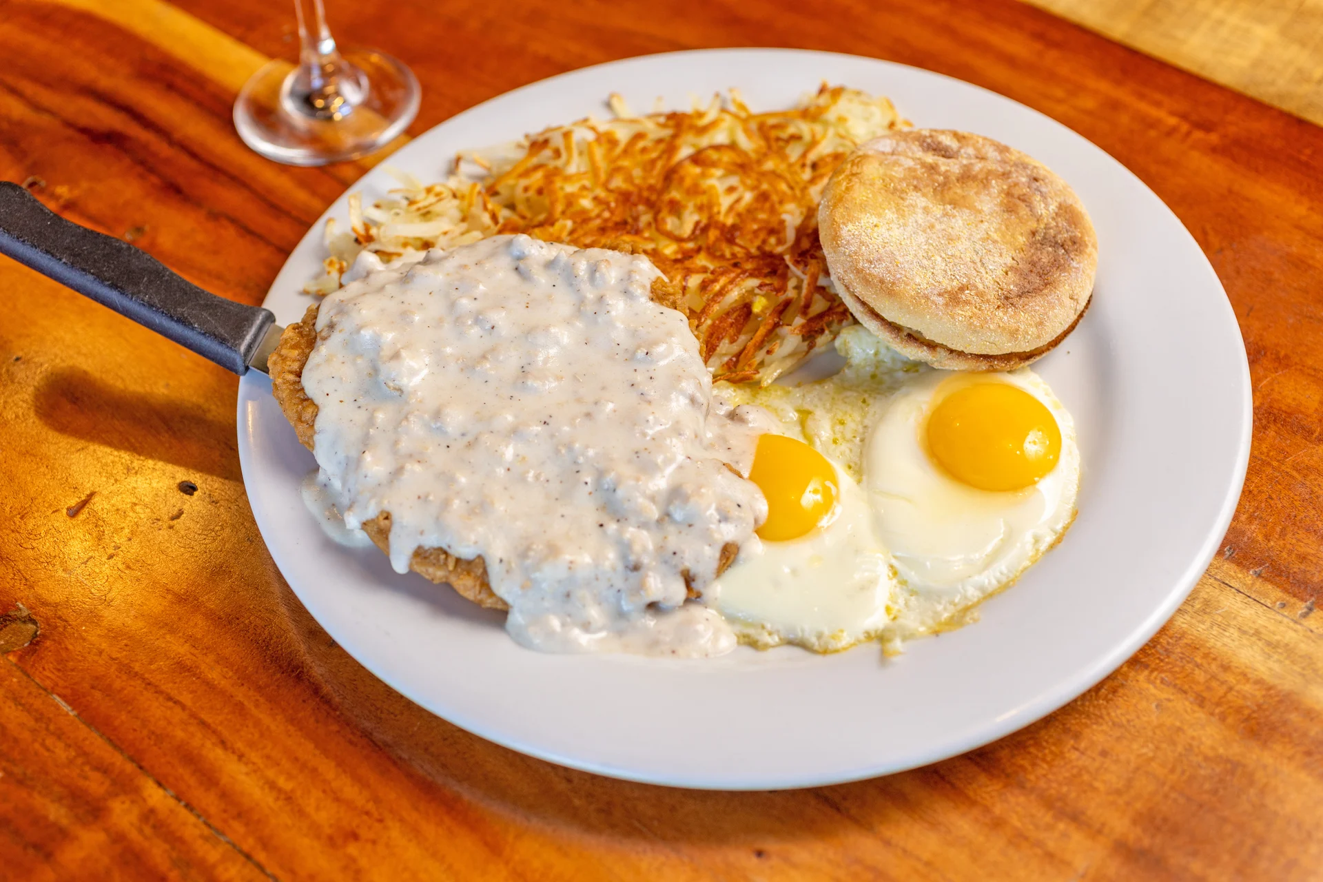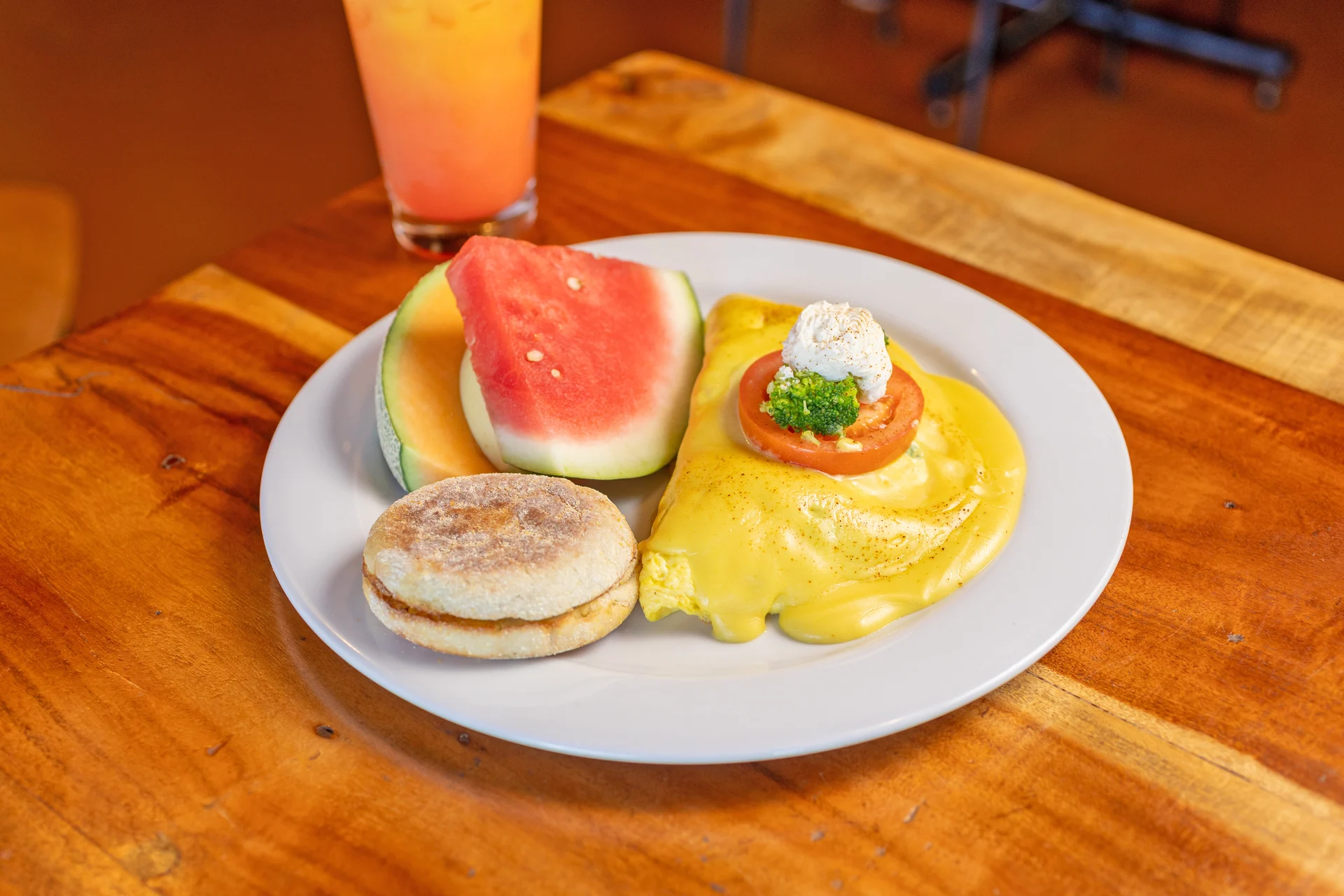 Toasted English muffin, Canadian bacon, poached eggs, topped with Hollandaise sauce.