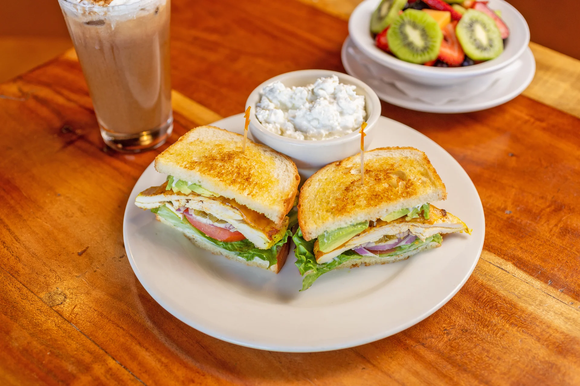 Grilled chicken breast, mayonnaise, lettuce, tomatoes, red onions, avocado, bacon, jack & cheddar cheese on brioche bun.