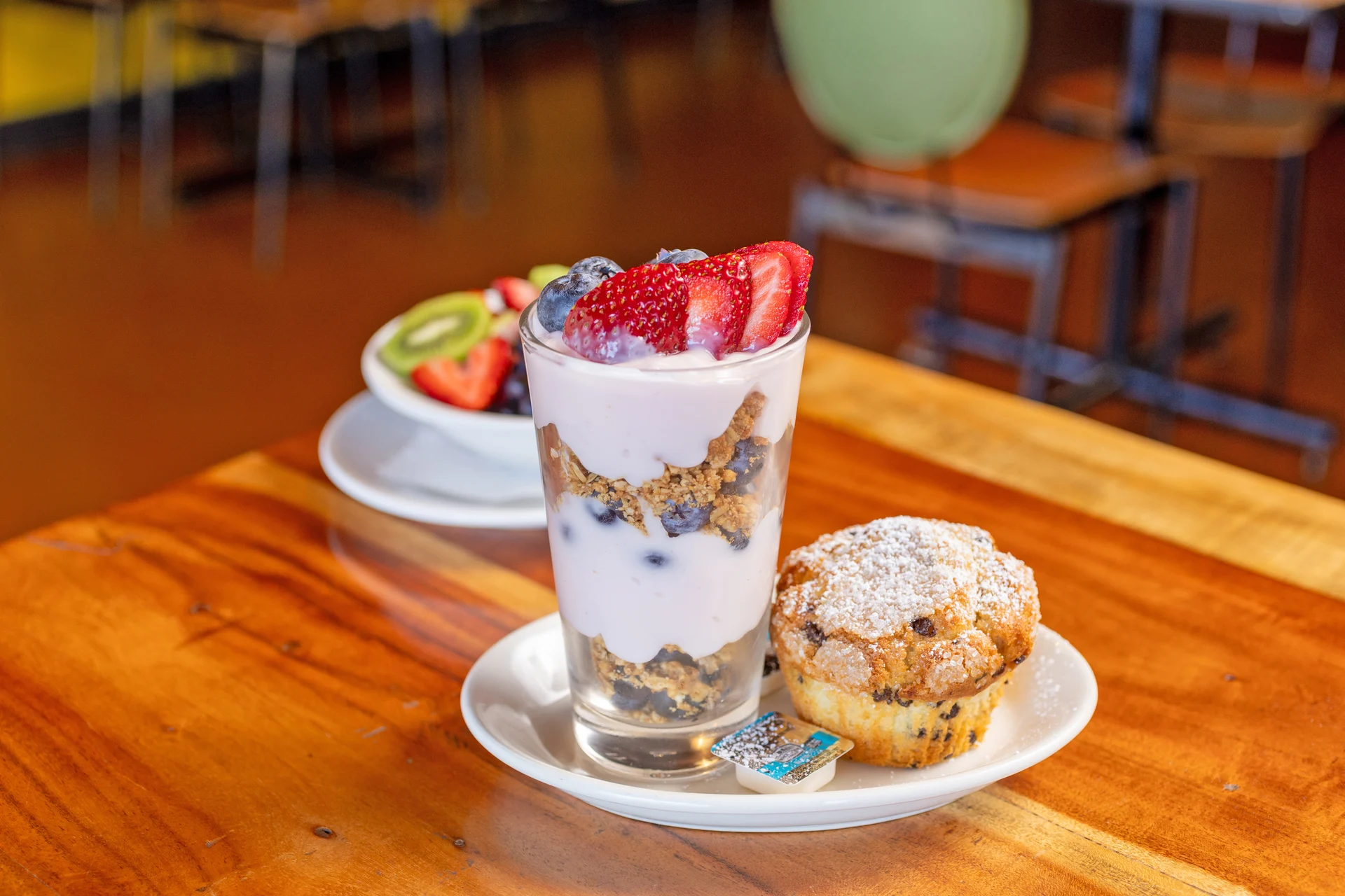 Strawberry yogurt, granola, blueberries and fresh strawberries. Add a blueberry, chocolate chips or banana walnut muffin. 12.25