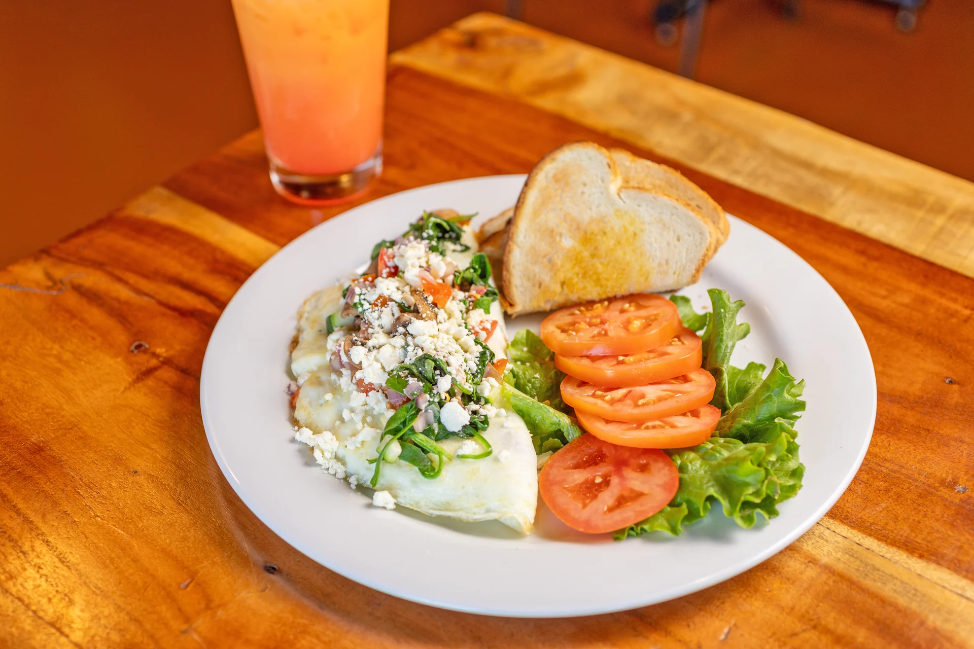 Start with fresh egg whites, tomatoes, mushrooms, zucchini, red onions, sautéed spinach, and feta cheese.
